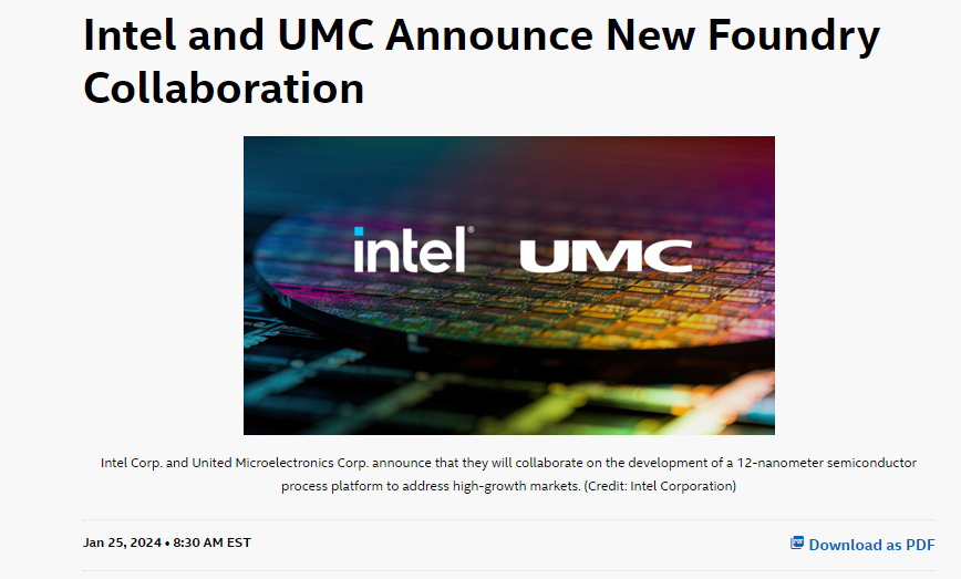 顶点光电子商城2024年1月26日消息:近日,联电与英特尔共同宣布,双方将合作在英特尔美国亚利桑那州厂开发和制造12nm制程平台,以因应行动、通讯基础建设和网络等市场快速成长需求。